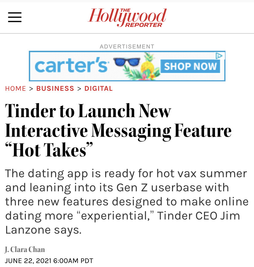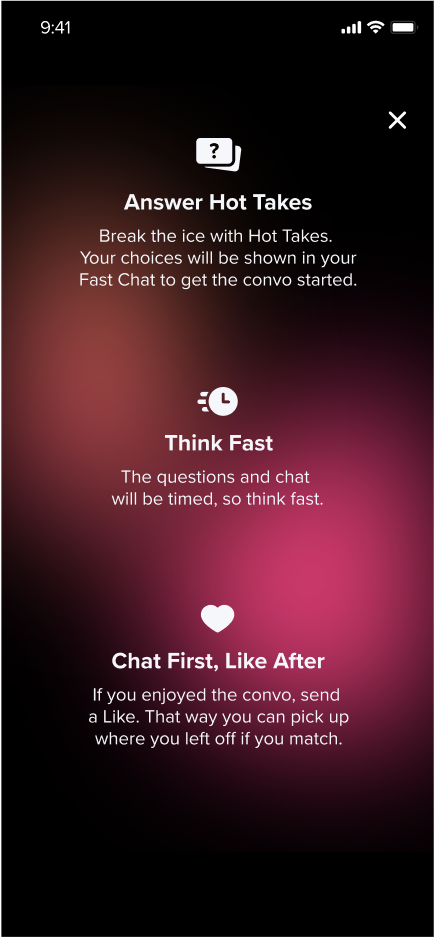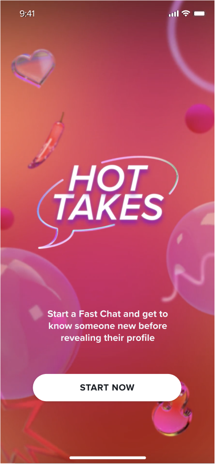 I was tasked with writing 250 questions for a feature called Fast Chat: Hot Takes. Each question allowed members to show off their personality and break the ice before chatting with a potential match. This project required me to flex my comedic muscle while remaining authentic to Tinder and entertaining the audience. The product was really well received by members and press, and remains one of the most popular features to date.